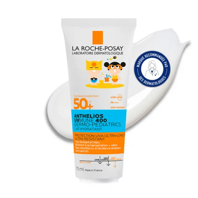 Efficacité cliniquement prouvée, formule testée sous contrôle dermatologique et pédiatrique : allégée en filtres chimiques :