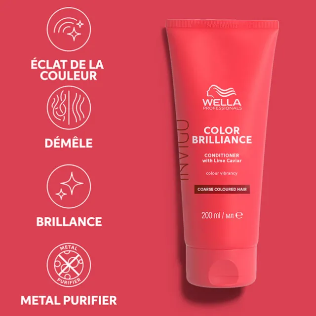 « L’après-shampoing Wella Professionals Invigo Color Brilliance est spécialement conçu pour les cheveux colorés et épais. Il démêle et lisse la surface du cheveu pour des cheveux soyeux et une couleur éclatante. Formulé avec la technologie Metal Purifier¹, il optimise la protection contre les radicaux libres et encapsule les métaux nocifs présents dans l’eau pour maintenir l’éclat de la couleur. Résultat : une brillance instantanée et une protection de la couleur.