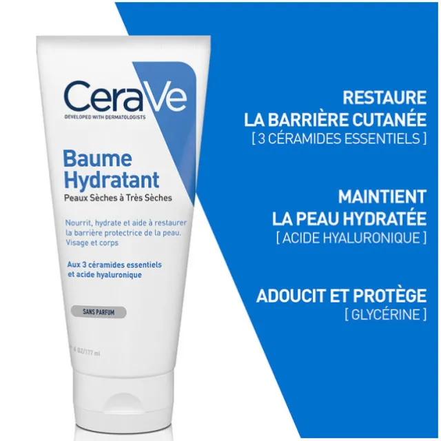Développé avec des dermatologues, le Baume Hydratant CeraVe nourrit, hydrate la peau en continu pendant 48H. Ce soin enrichi aux 3 céramides essentiels naturellement présents dans la peau et à l’acide hyaluronique restaure la barrière cutanée.