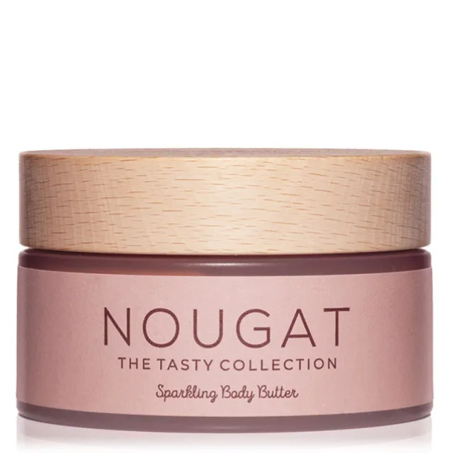 Ce beurre corporel scintillant au parfum gourmand de nougat unifie la peau et l’hydrate en profondeur.