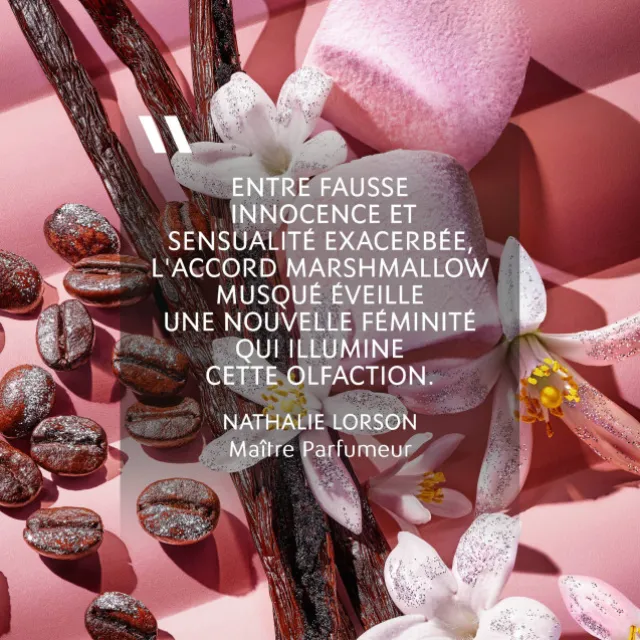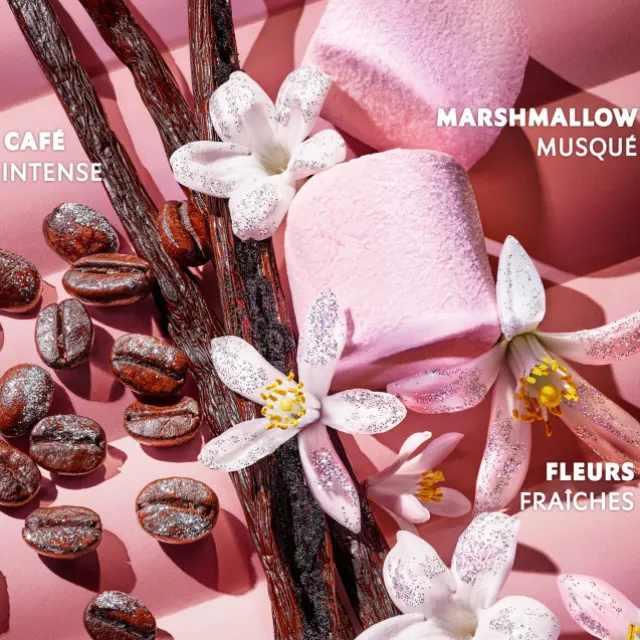 L’accord iconique du café floral s’enveloppe d’une irrésistible tentation : un accord marshmallow musqué*.