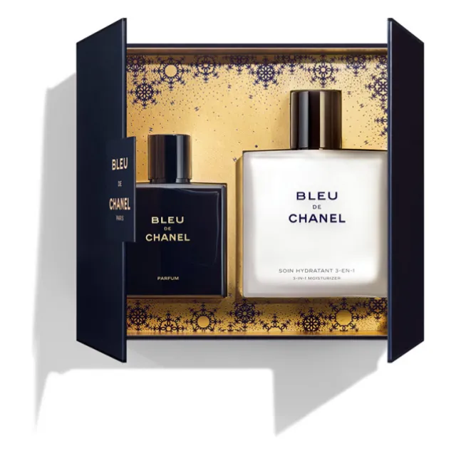 Magnifiés dans un écrin en édition limitée habillé des flocons signatures, BLEU DE CHANEL Parfum et BLEU DE CHANEL Soin Hydratant 3-en-1 offrent un rituel masculin aux notes aromatiques et boisées.