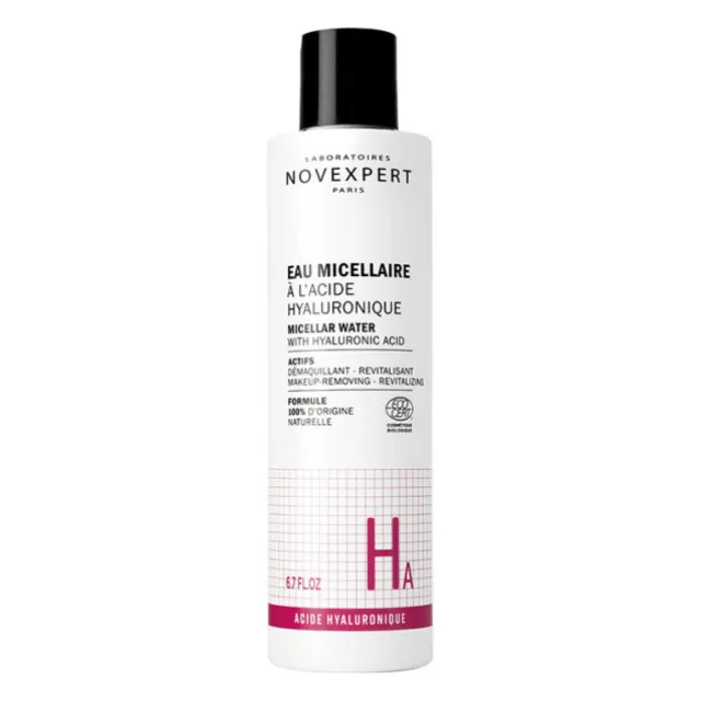 Réponses de l’Eau Micellaire Novexpert : côté pile, une formule 100% d’origine naturelle et hypoallergénique, côté face, une formule gorgée d’acide hyaluronique. Un nettoyant, un démaquillant (visage & yeux), et un soin revitalisant à part entière !