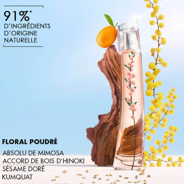 Ce nouveau bouquet floral, FLOWER IKEBANA MIMOSA, marie la meilleure qualité de Mimosa, le mimosa du Tanneron à des matières premières d’exception pour une Eau de Parfum composée à 91% d’ingrédients d’origine naturelle*.