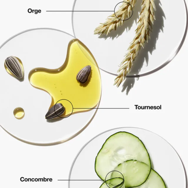 – 3 pro-lipides : un mélange d’extraits d’orge, de tournesol et de concombre pour hydrater et équilibrer la barrière cutanée.