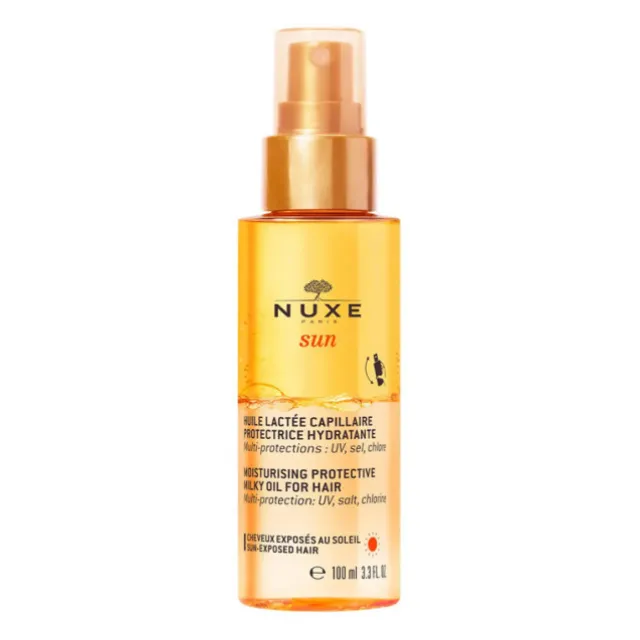 Cette huile lactée bi-phase protège vos cheveux des rayons UV tout en leur apportant hydratation et brillance. Elle s’utilise avant et pendant la baignade pour les préserver des effets du sel et du chlore, tout en protégeant votre couleur.
