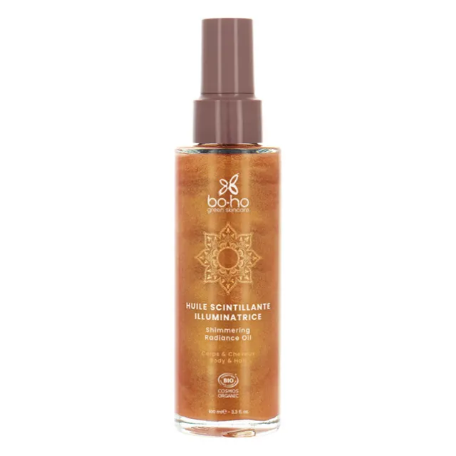 L’Huile Scintillante Illuminatrice nourrit, satine et illumine la peau et les cheveux de reflets dorés.