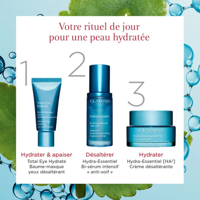 La nuit, la peau perd davantage d’eau car sa fonction barrière est moins efficace que le jour. Il convient donc d’utiliser en complément de la crème jour Hydra-Essentiel [HA²], un soin de nuit : découvrez Hydra-Essentiel [HA²] Soin de nuit repulpant «anti-soif» qui hydrate, repulpe intensément et atténue les rides de déshydratation.