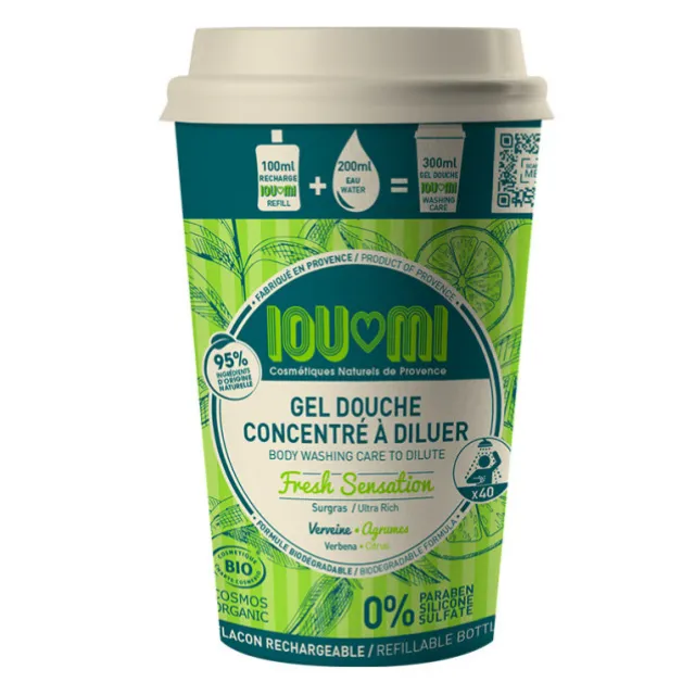 Gel douche naturel et bio concentré à diluer Verveine & Agrumes, la Fresh Sensation du matin conditionnée dans notre joli flacon écologique, rechargeable et réutilisable à vie !