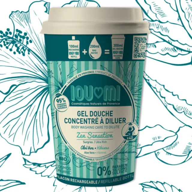 Gel douche bio concentré à diluer Aloe vera & Hibiscus, la Zen Sensation du matin conditionnée dans notre joli flacon écologique, rechargeable et réutilisable à vie !