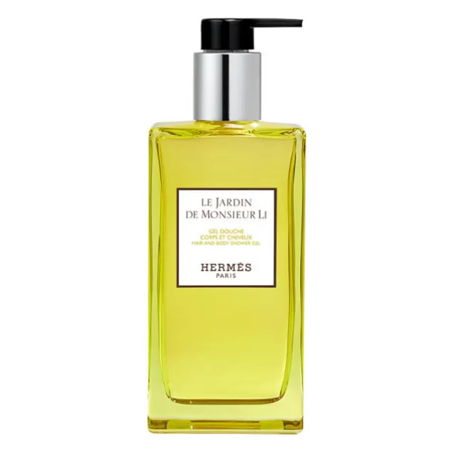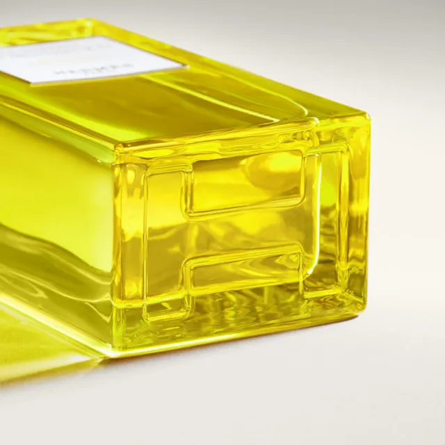 La silhouette rectiligne du flacon s’anime d’un jaune délicat, emblématique de l’eau de toilette Le Jardin de Monsieur Li, et de deux détails signature : le H comme une empreinte sur le socle et le clou de selle gravé sur la pompe.