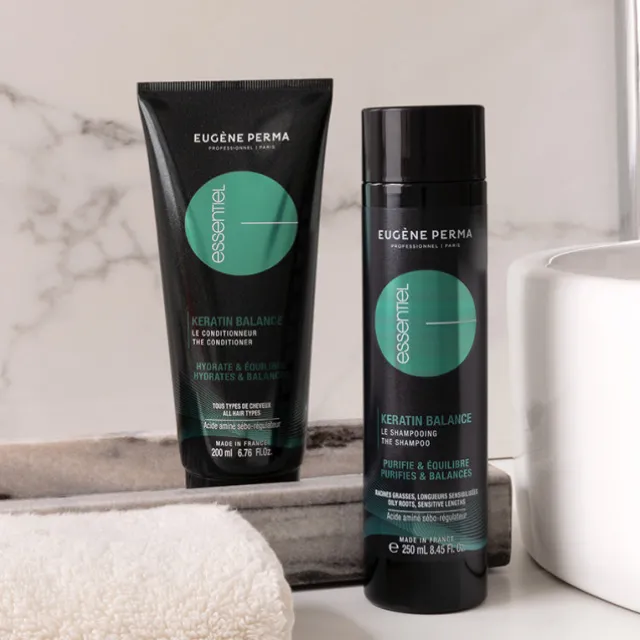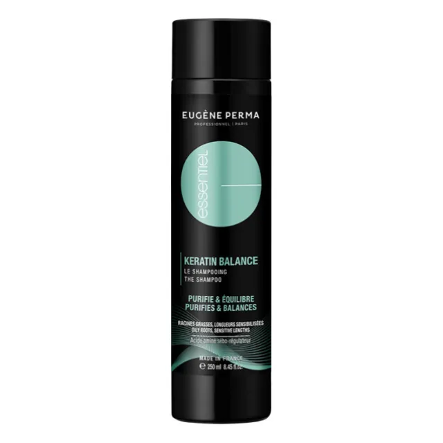 Le shampooing Essentiel KERATIN BALANCE d’EUGENE PERMA Professionnel rééquilibre les cuirs chevelus à tendance grasse et aux longueurs sèches. Grâce à la combinaison de la Kératine* et d’un acide aminé sébo-régulateur, le shampooing élimine en douceur l’excès de sébum tout en préservant la fibre.