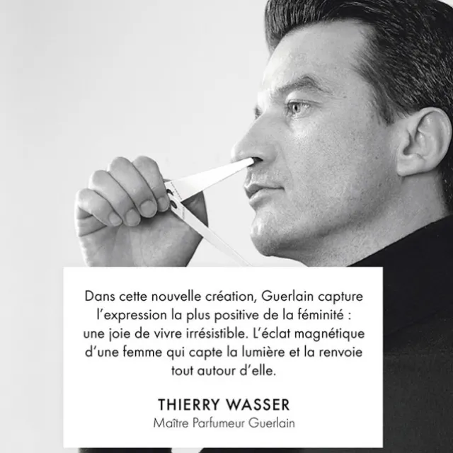 C’est l’empreinte olfactive d’une personnalité radieuse. Une fragrance facettée comme un joyau, qui rejoue dans un registre fruité et intensément lumineux les ingrédients essentiels de Mon Guerlain : lavande, jasmin Sambac, vanille Tahihensis et santal. Un accord poire souffle une ouverture joyeuse à cette composition. Un irrésistible sourire… Pétillant et espiègle, il fond ses accents fruités dans un cœur floral contrasté où la fraîcheur de la lavande nuance les accents solaires du jasmin. Puis la vanille installe son parfum délicieux : lovée dans les notes boisées crémeuses du santal, elle tisse un sillage oriental tendre et sensuel.