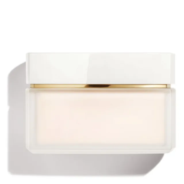 Dans un pot en verre subtilement givré, la crème pour le corps N°5 enrichie d’un actif de rose et de jasmin parfait le sillage de N°5 avec subtilité.