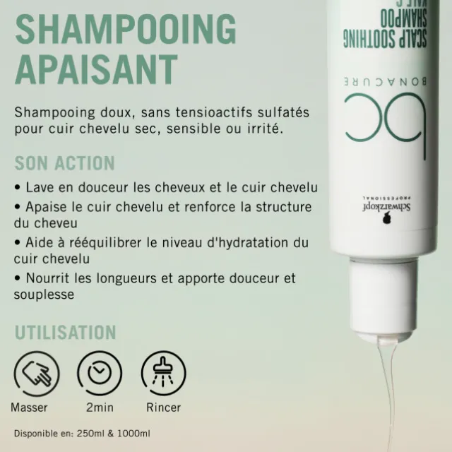 Pour optimiser les résultats, il est recommandé d’associer ce shampooing avec le sérum apaisant BC Bonacure Scalp Sérum.