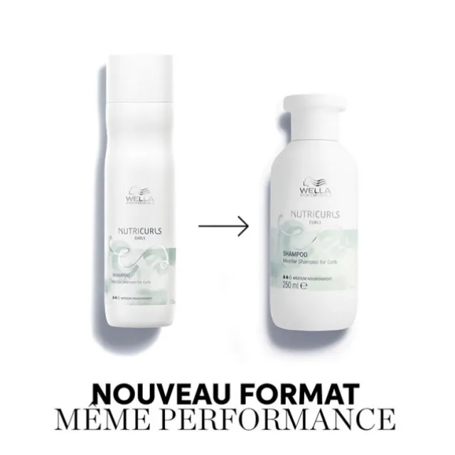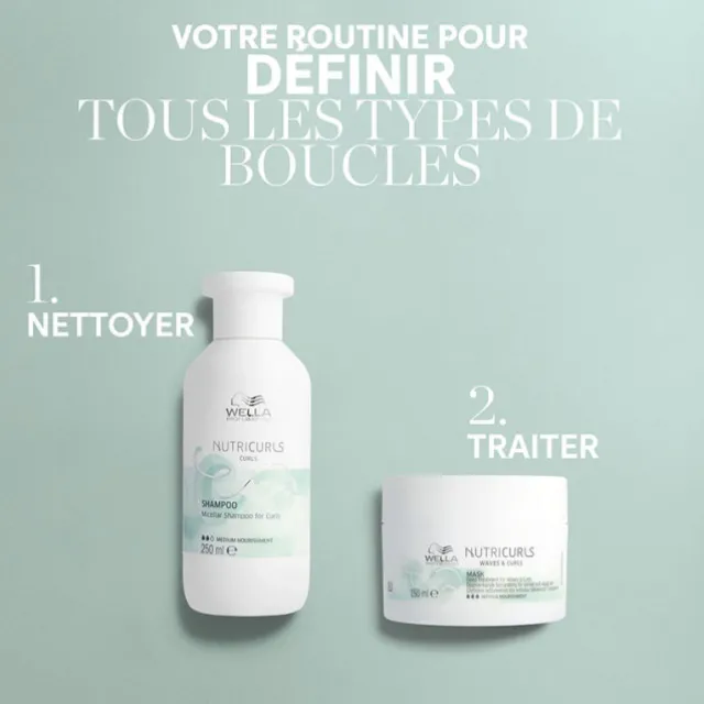 Utilisez le shampoing Micellaire cheveux bouclés avec l’après-shampoing et masque Nutricurls Wella Professionals pour de meilleurs résultats.