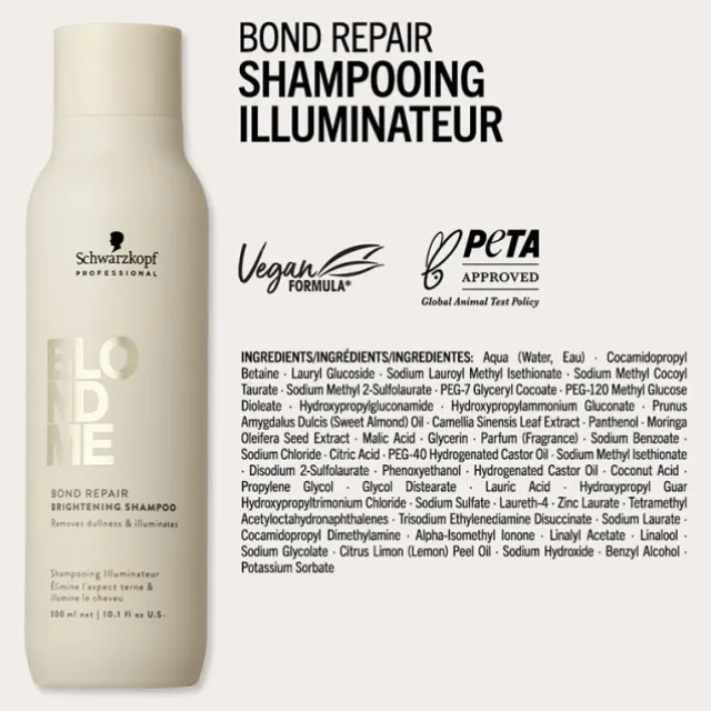 Nettoie et illumine les cheveux blonds en éliminant les restes de produits, les impuretés et les polluants environnementaux. Avec la TECHNOLOGIE BOND REPAIR, le Shampooing Illuminateur pour cheveux blonds BLONDME permet de renforcer les liaisons internes du cheveu, en réparant les dommages équivalents à deux services de décoloration en une seule utilisation. Sa formule légère et hydratante, enrichie en huile d’amande et en thé blanc, laisse les cheveux blonds souples avec une brillance saine.