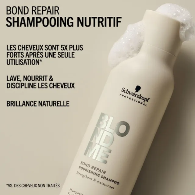 Le Shampooing Nutritif BLONDME Bond Repair nettoie en douceur et hydrate les cheveux blonds. La TECHNOLOGIE BOND REPAIR renforce les cheveux blonds sensibilisés en créant des liaisons internes réparant des dommages équivalents à deux services de décoloration après une seule utilisation. La formule nourrissante est enrichie en huile d’amande et en thé blanc, lissant les cheveux et les laissant souples et hydratés.