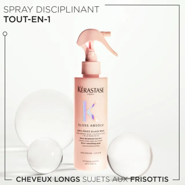 Le Anti-Frizz Glaze Milk de Kérastase est un spray brillance disciplinant tout-en-1 pour cheveux longs sujets aux frisottis. Il est spécifiquement formulé avec de l’acide hyaluronique, de l’acide glycolique et de l’huile de rose sauvage sourcée en Auvergne (France), pour offrir des cheveux de rêve.