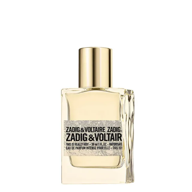 Un flacon de parfum au look métallisé, inspiré de la mode, le flacon de This Is Really Her! a été relooké pour se revêtir d’un effet métallisé, incarnant le chic éternel du style ZADIG&VOLTAIRE. Rehaussé d’éléments dorés éblouissants, le design évoque les lumières étincelantes d’une nuit inoubliable dans la Ville Lumière. Le verre lisse contraste avec l’étiquette emblématique ZADIG&VOLTAIRE désormais texturée évoquant le cuir métallisé pour un look sensuel et subversif.