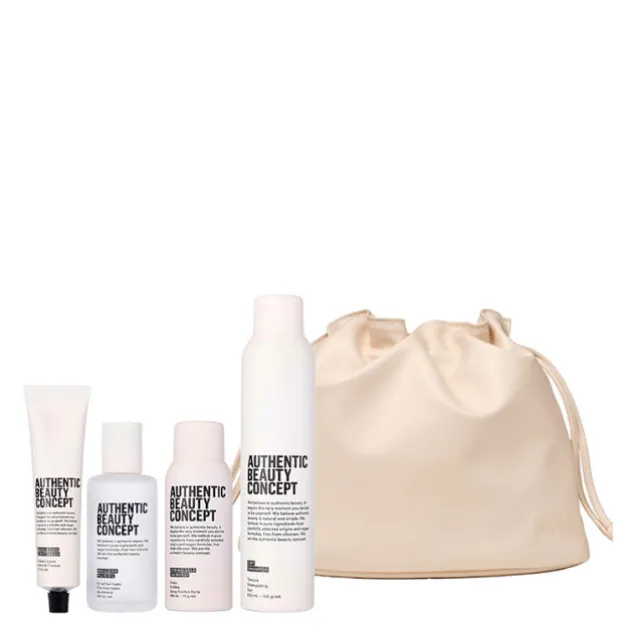 Dans une pochette en cuir végan souple et versatile, que vous pouvez emporter partout avec vous, elle contient un Shampoing Sec, une Huile Fluide Sublimatrice et une Crème Mains & Cheveux Authentic Beauty Concept.