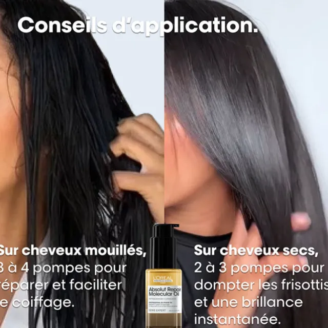 *****Test consommateur après 2 semaines d’utilisation du Shampooing + Sérum à rincer + Masque + Huile Absolut Repair Molecular. Répare 2 ans de dommages*, apporte jusqu’à 100 heures de brillance**, 3 jours de contrôle des frisottis et 3 fois plus de nutrition** sans alourdissement.