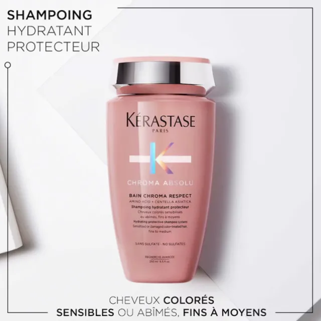 Le Bain Chroma Respect est un shampooing protecteur hydratant et doux pour tous les types de cheveux colorés, sensibilisés ou abîmés, principalement adapté aux cheveux d’épaisseur fine à moyenne.
