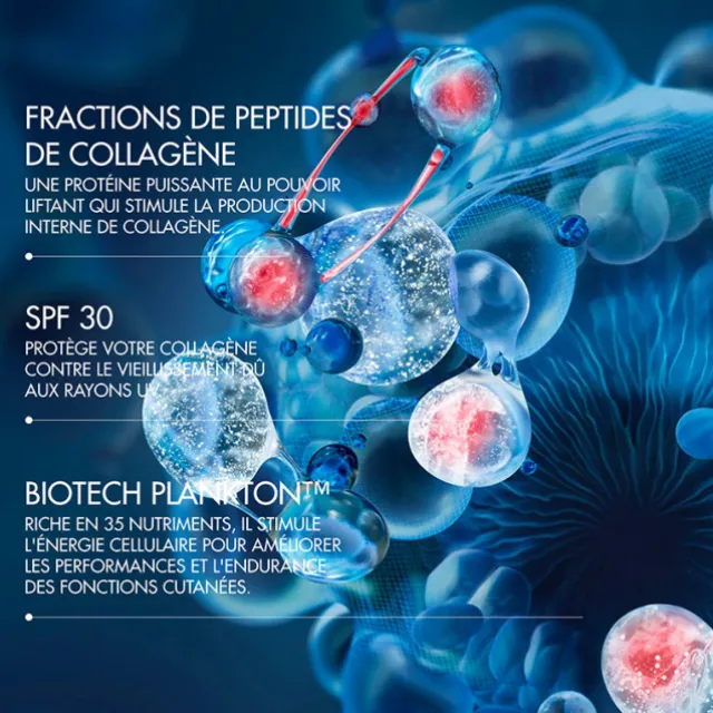 En s’appuyant sur des innovations de pointe en biosciences, le Biotech Plankton™, riche en 35 nutriments, amplifie de 5 fois l’efficacité des Fractions de Peptides de Collagène sur le collagène interne*. Le boost du collagène donne à votre peau le soutien structurel dont elle a besoin pour renforcer la fermeté de la peau en seulement 4 heures** et lifter visiblement la peau***.