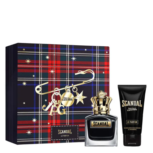 Pour ouvrir les festivités, Jean Paul Gaultier revêt son coffret Scandal Pour Homme Le Parfum et son boisé ambré d’un tartan audacieux.