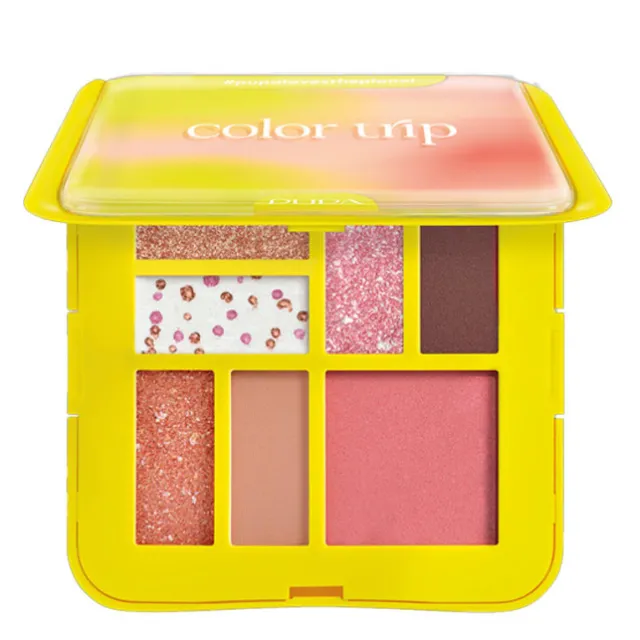 6 fards à paupières à finitions multiples et 1 fard à joues enlumineur.
