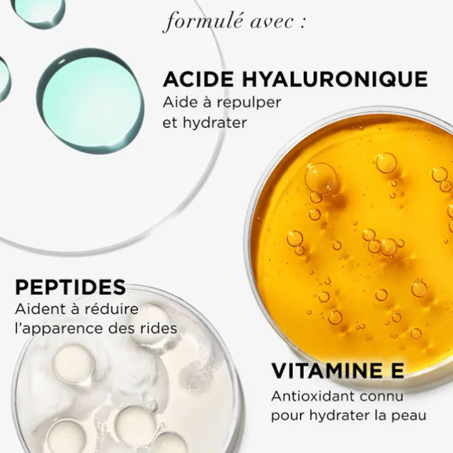 • À base de sérum de soin solide à 95 % comprenant de l’acide hyaluronique, de la céramide, de la vitamine E et des peptides dans une formule hydratante et lissante