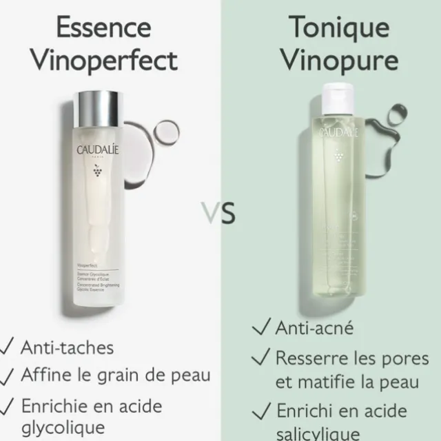 L’Essence Glycolique Concentrée d’Éclat est la 1ère étape de la routine anti-taches Vinoperfect et s’adresse à toutes les femmes qui souhaitent prévenir ou atténuer leurs taches brunes, quelle que soit leur nature : soleil, acné, âge, grossesse.