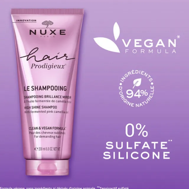 Né de l’expertise du Laboratoire Nuxe sur les huiles végétales, le Shampooing Brillance Miroir lave et parfume délicatement les cheveux. Formulé sans silicone et sans sulfate*, ce shampooing, à l’huile fermentée de camélia rose, nourrit sans alourdir la fibre capillaire. Sa texture lait à la fragrance mythique de l’Huile Prodigieuse® enveloppe les cheveux pour un rituel sensoriel inouï. Les cheveux sont éclatants de brillance au toucher soyeux addictif.