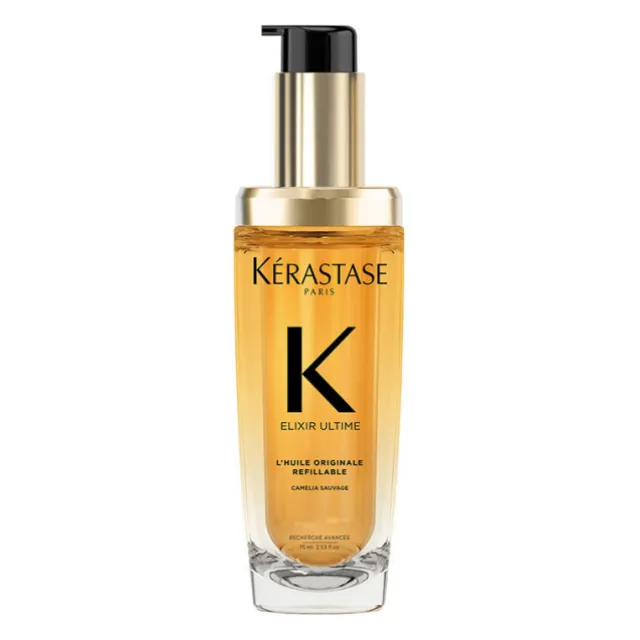Conçue pour durer, l’écrin doré de cette huile capillaire emblématique est désormais rechargeable et se présente sous la forme de deux pièces : un flacon extérieur en verre recyclé à 30 % et une recharge en plastique recyclé à 95 %***.
