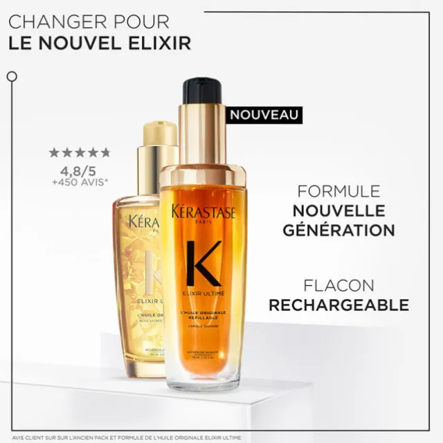 L’Huile Originale Elixir Ultime peut être utilisée comme bain d’huile avant votre shampoing, avant votre brushing grâce à sa thermoprotection 230°C **, ainsi que pour les finitions au moment du coiffage et les retouches au cours de la journée, afin de rendre les cheveux plus lisses, plus brillants et faciles à coiffer. Elle peut être utilisée en complément de toutes les routines Kérastase.