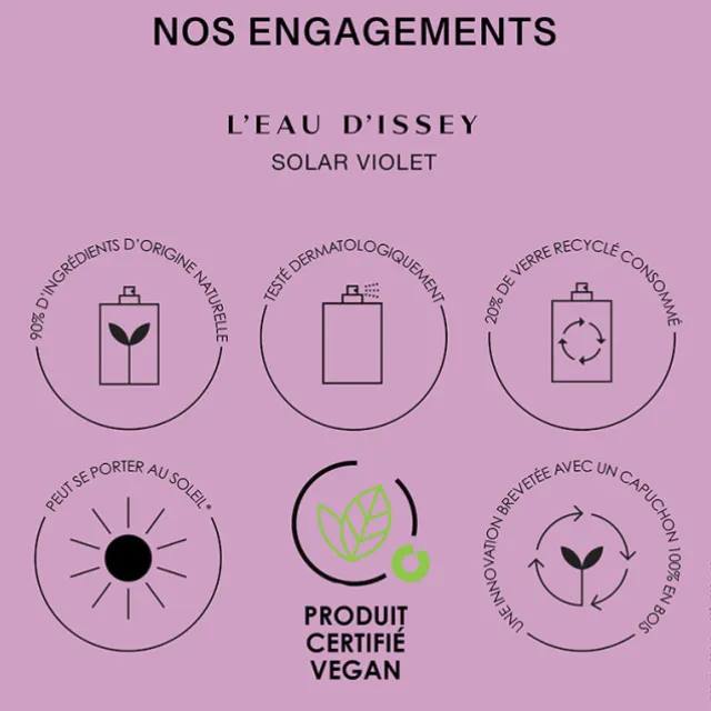 Pour rendre hommage à la nature, ce parfum est composé à 90 % d’ingrédients d’origine naturelle. La violette 100% d’origine naturelle contenue dans L’Eau d’Issey Solar Violet est sourcée de manière responsable en Égypte.