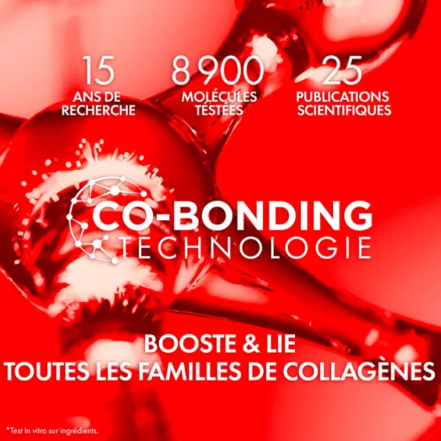 Technologie Co-Bonding exclusive [Rhamnose + Peptides + Maitake] booste et lie toutes les familles de collagène* + [SPF 50] pour protéger votre peau de l’exposition solaire quotidienne.