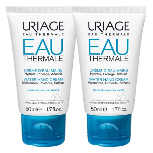 Uriage Crème d’Eau Mains Lot de 2 x 50 ml à la texture légère et non grasse est un soin ultra-émollient idéal pour hydrater, protéger et adoucir les mains sèches.
