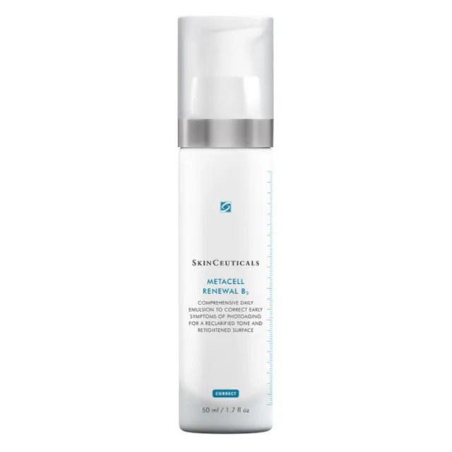 Metacell Renewal B3 est une émulsion multi-corrective quotidienne qui agit visiblement sur les premiers symptômes de l’âge : ridules, teint non homogène, texture de peau, perte d’élasticité, grâce à un cocktail d’actifs hautement concentrés : 5 % de Niacinamide, 2.5 % de Concentré Tri-Peptide Raffermissant et 15 % de Glycérine.