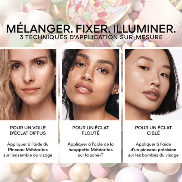 Prélever la poudre en mélangeant les perles avec le pinceau Météorites¹ et l’appliquer sur l’ensemble du visage pour un éclat diffus.