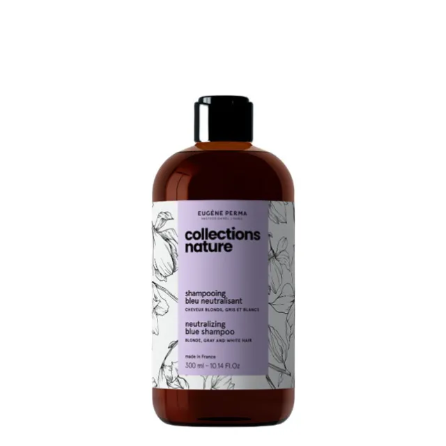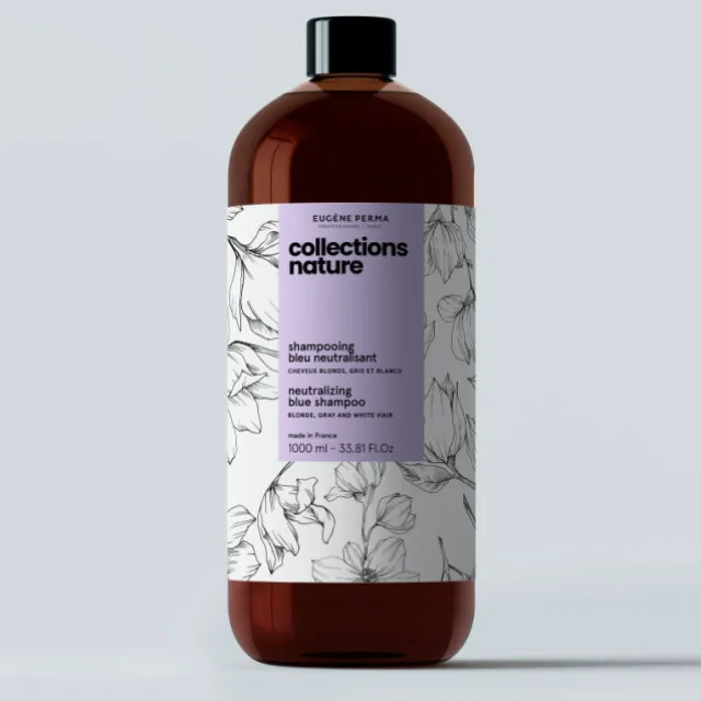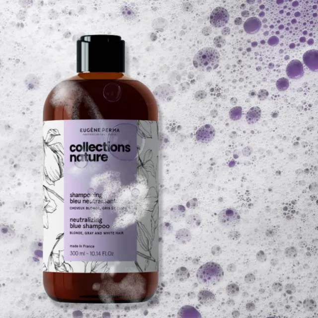 Shampooing bleu neutralisant pour nettoyer en douceur, neutraliser les reflets jaunes indésirables et illuminer la chevelure.