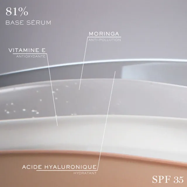 81% base sérum enrichie d’acide hyaluronique hydratant et d’actifs soin protecteurs : Moringa anti-pollution, Vitamine E antioxydante