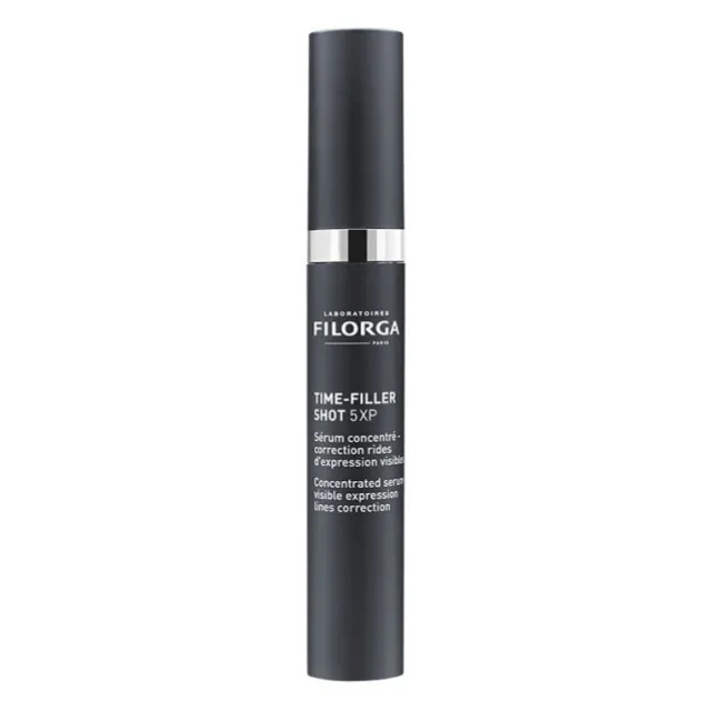 TIME-FILLER SHOT 5XP est un sérum visage intensif qui décrispe les traits en ciblant et corrigeant les premières rides d’expression visibles.