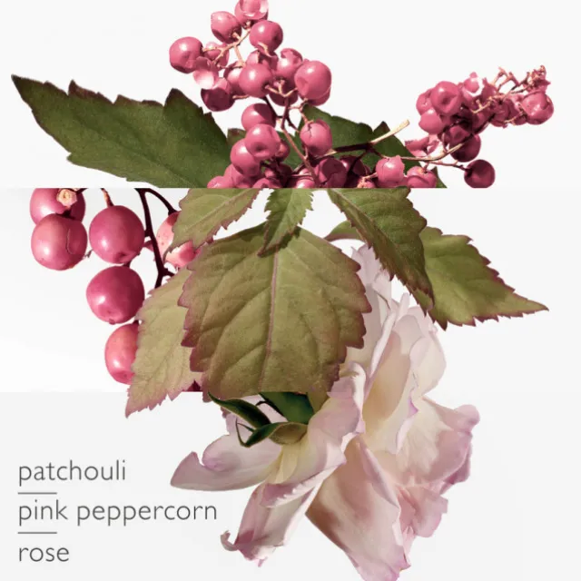 Un parfum coloré d’une baie rose vibrante, d’une rose tendre et d’un patchouli racé. Epicé, floral, boisé.