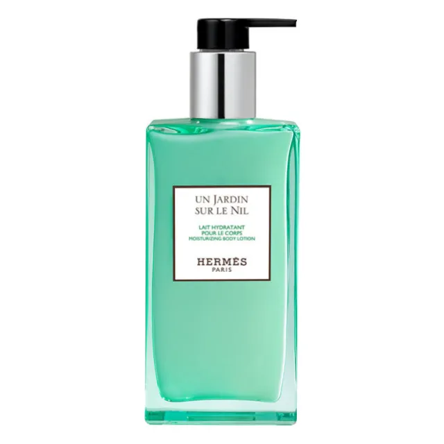 La silhouette rectiligne du flacon s’anime d’un vert délicat, emblématique de l’eau de toilette Un Jardin sur le Nil, et de deux détails signature : le H comme une empreinte sur le socle et le clou de selle gravé sur la pompe.