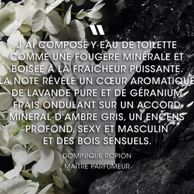 Y, Eau de Toilette est le fruit de la mise en tension de la lavande et de la sauge sclarée, ingrédients phares de la gamme Y, tous deux cultivés en Provence, avec le cœur géranium de Madagascar. Ce sillage à la fraîcheur ultime gagne en profondeur et en tenue grâce aux bois sensuels travaillés aux côtés de l’ambre gris et de l’encens, des matières premières à la senteur addictive.